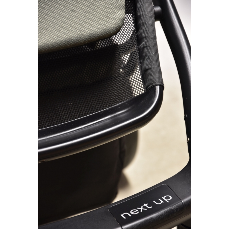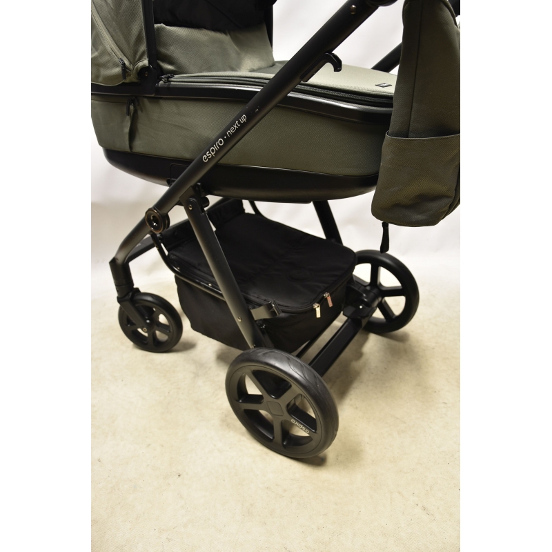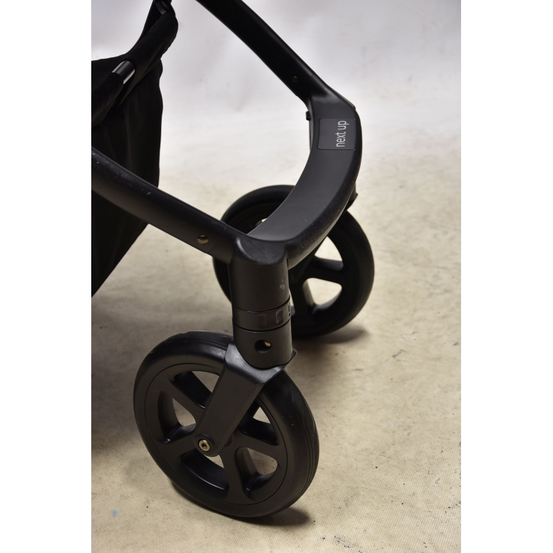 Stelaż wózka next ma służyć rodzicom i dzieciom nawet przez 4 lata. aby był jak najlżejszy został wykonany z trwałego aluminium. Wózek wyposażony jest w 4 bezobsługowe koła, których nie da się przebić, ani nie trzeba pompować. Wnętrze kół wypełnia superlekka tzw. pianka EVA, która zapewnia doskonałą amortyzację, a na zewnątrz kół znajduje się gumowa opona z bieżnikiem. Wózek posiada nowoczesny zabudowany mechanizm amortyzacji wszystkich kół - osłony chronią go przed zabrudzeniami i uszkodzeniami. Wpinany na stelaż pojemny kosz mieści wiele akcesoriów, a zapinana na zamek pokrywa zebezpiecza je przed wypadaniem.