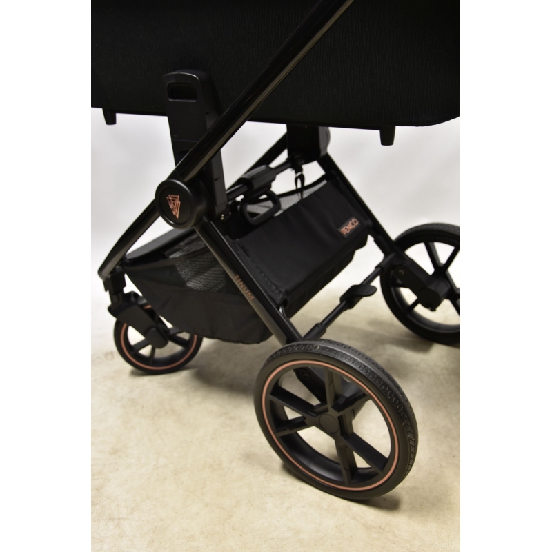 Warto podkreślić, że stelaż Tinum 2.0 wykonano z niezwykle lekkiego, wytrzymałego i odpornego na uszkodzenia aluminium. Za sprawą tego rozwiązania, sama rama wózka od Venicci waży zaledwie 5,5 kg, a cała konstrukcja – wraz z wpiętą gondolą lub siedziskiem spacerowym – 12 kg. To sprawia, że jest ona nie tylko wyjątkowo łatwa w prowadzeniu, ale także wygodna do przenoszenia po złożeniu.