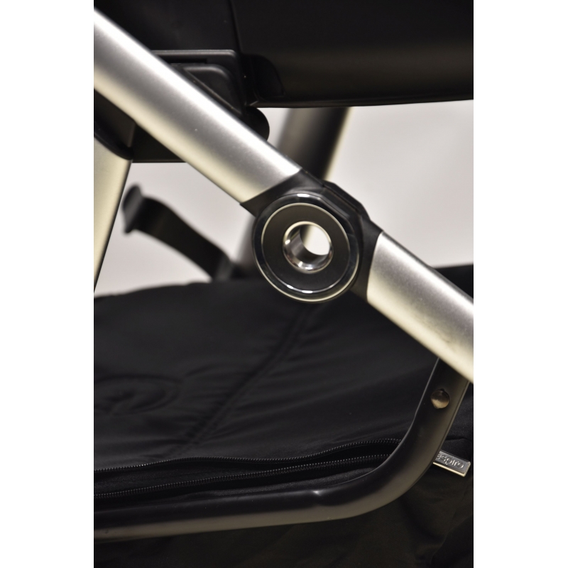 Stelaż wózka next ma służyć rodzicom i dzieciom nawet przez 4 lata. aby był jak najlżejszy został wykonany z trwałego aluminium. Wózek wyposażony jest w 4 bezobsługowe koła, których nie da się przebić, ani nie trzeba pompować. Wnętrze kół wypełnia superlekka tzw. pianka EVA, która zapewnia doskonałą amortyzację, a na zewnątrz kół znajduje się gumowa opona z bieżnikiem. Wózek posiada nowoczesny zabudowany mechanizm amortyzacji wszystkich kół - osłony chronią go przed zabrudzeniami i uszkodzeniami. Wpinany na stelaż pojemny kosz mieści wiele akcesoriów, a zapinana na zamek pokrywa zebezpiecza je przed wypadaniem.