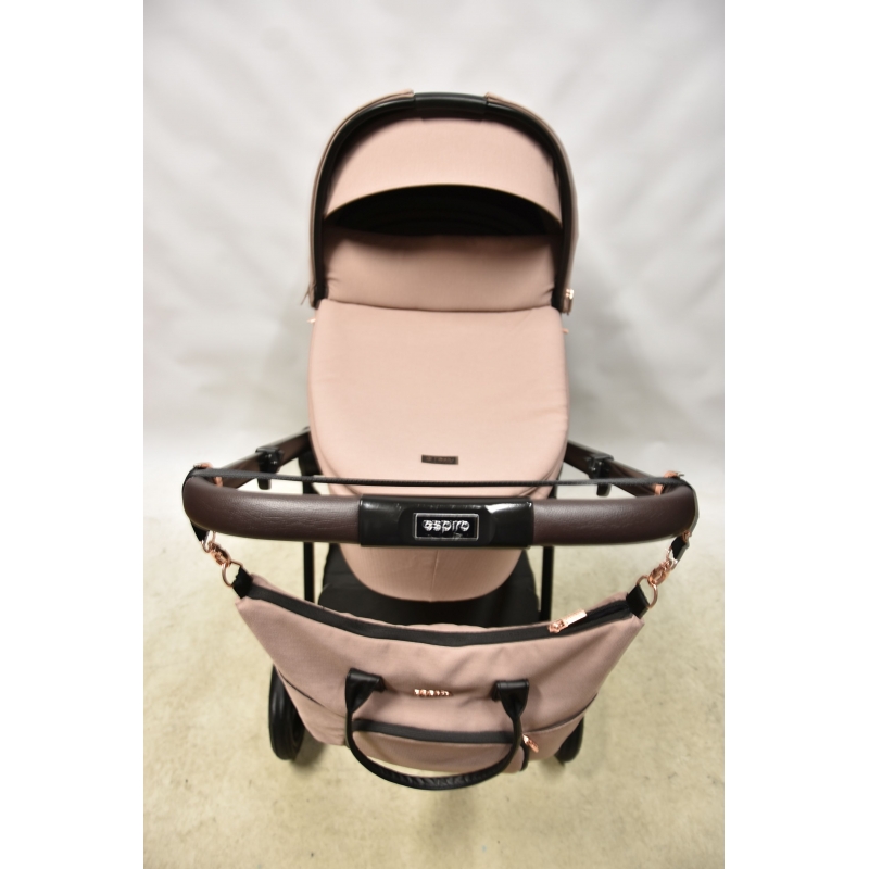 Teleskopowo regulowana rączka z ekoskóry sprawia, że wózek wygodnie prowadzi się rodzicom o wysokim, jak i niższym wzroście.