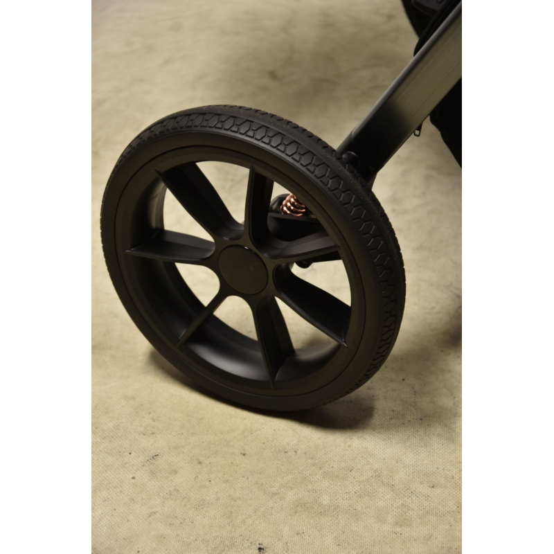 Wózek Carrello Ultra został wyposażony w duże koła wykonane z miękkiej gumy, które doskonale sprawdzają się w terenie. Dzięki swojej konstrukcji zapewniają świetną przyczepność na różnych nawierzchniach, a jednocześnie skutecznie amortyzują wstrząsy, co zwiększa komfort jazdy zarówno dla dziecka, jak i rodzica. Przednie koła posiadają możliwość blokady do jazdy na wprost, co ułatwia prowadzenie w trudniejszym terenie i zapewnia stabilność podczas spacerów.