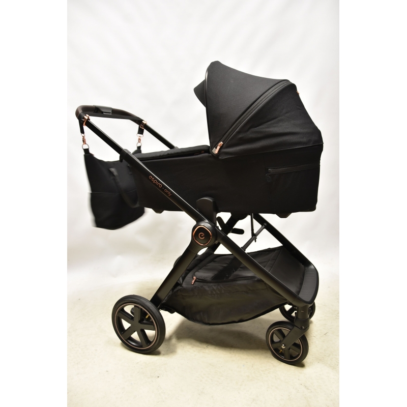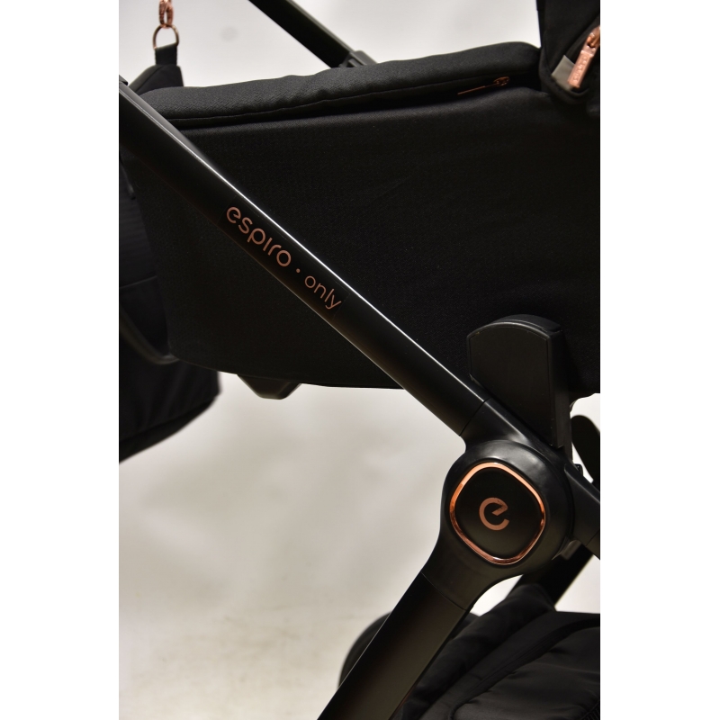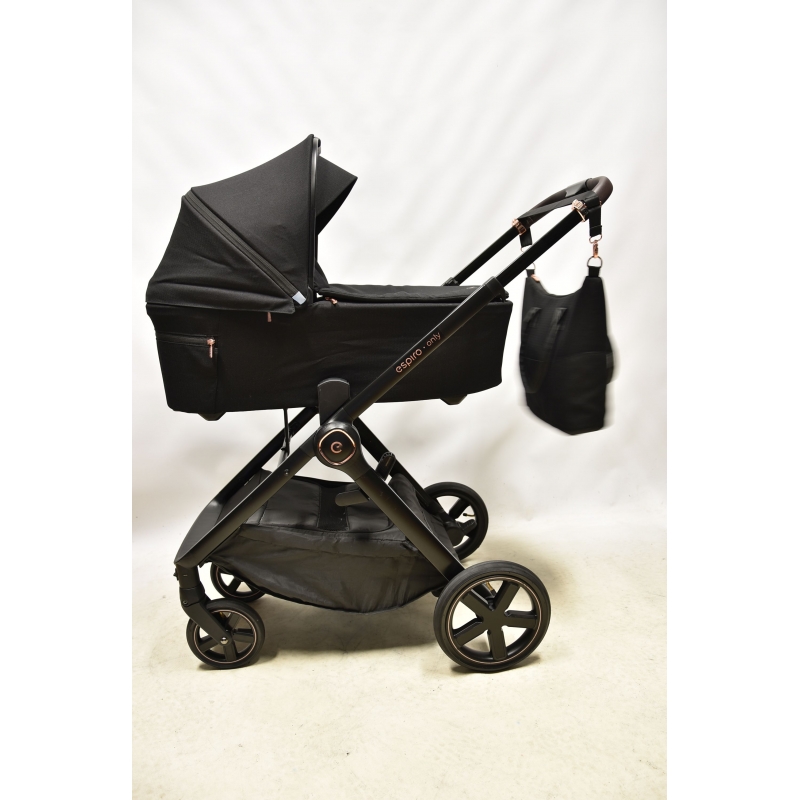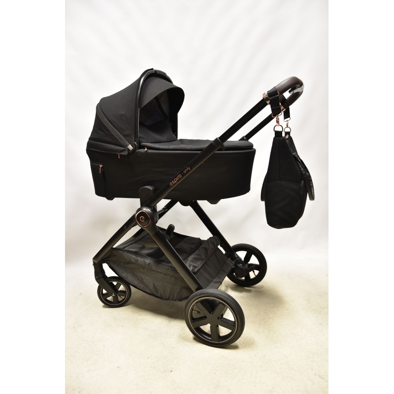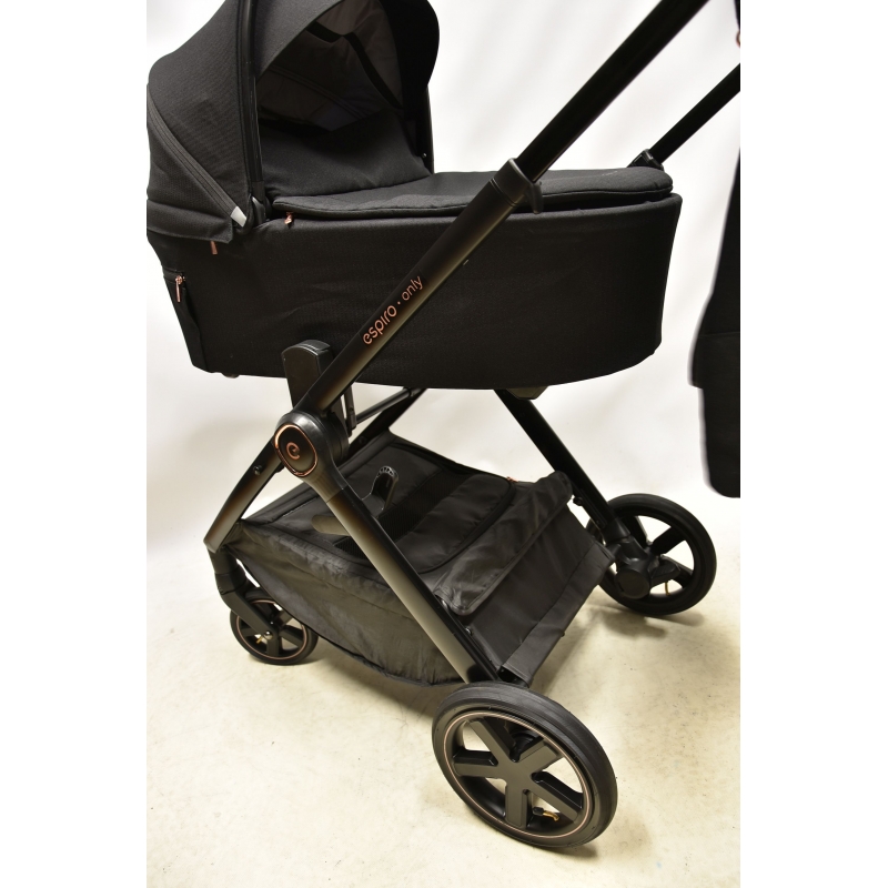 Gondola wózka espiro only waży zaledwie 3,9 kg oraz posiada obszerne wnętrze. Bardzo łatwo montuje się ją bezpośrednio na stelażu, bez konieczności użycia dodatkowych adapterów. Jest to niezwykle wygodne dla rodziców, którzy często przenoszą gondolę. Odpowiednią wentylację i komfort termiczny podczas gorących dni zapewniają duże okno wentylacyjne z siatką znajdujące się z tyłu budki. Podczas chłodniejszych dni gondolę można używać ze specjalnym pokrowcem na zamek i kołnierzem na magnesy. Dużym atutem jest jakościowy materacyk i wypinana wyściółka wykonane z mięciutkiego i przyjaznego dla dziecka materiału. Gondola posiada dodatkowy daszek oraz wbudowaną moskitierę - latem nie ma konieczności używania dodatkowych akcesoriów chroniących przed światłem, czy owadami.