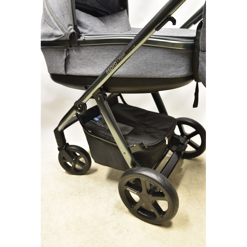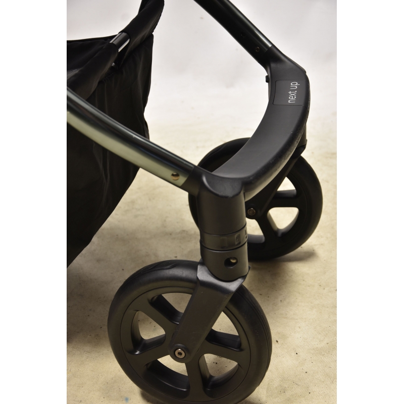 Stelaż wózka next ma służyć rodzicom i dzieciom nawet przez 4 lata. aby był jak najlżejszy został wykonany z trwałego aluminium. Wózek wyposażony jest w 4 bezobsługowe koła, których nie da się przebić, ani nie trzeba pompować. Wnętrze kół wypełnia superlekka tzw. pianka EVA, która zapewnia doskonałą amortyzację, a na zewnątrz kół znajduje się gumowa opona z bieżnikiem. Wózek posiada nowoczesny zabudowany mechanizm amortyzacji wszystkich kół - osłony chronią go przed zabrudzeniami i uszkodzeniami. Wpinany na stelaż pojemny kosz mieści wiele akcesoriów, a zapinana na zamek pokrywa zebezpiecza je przed wypadaniem.