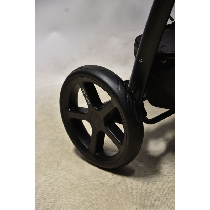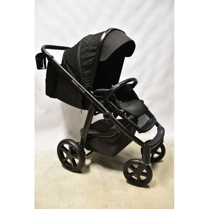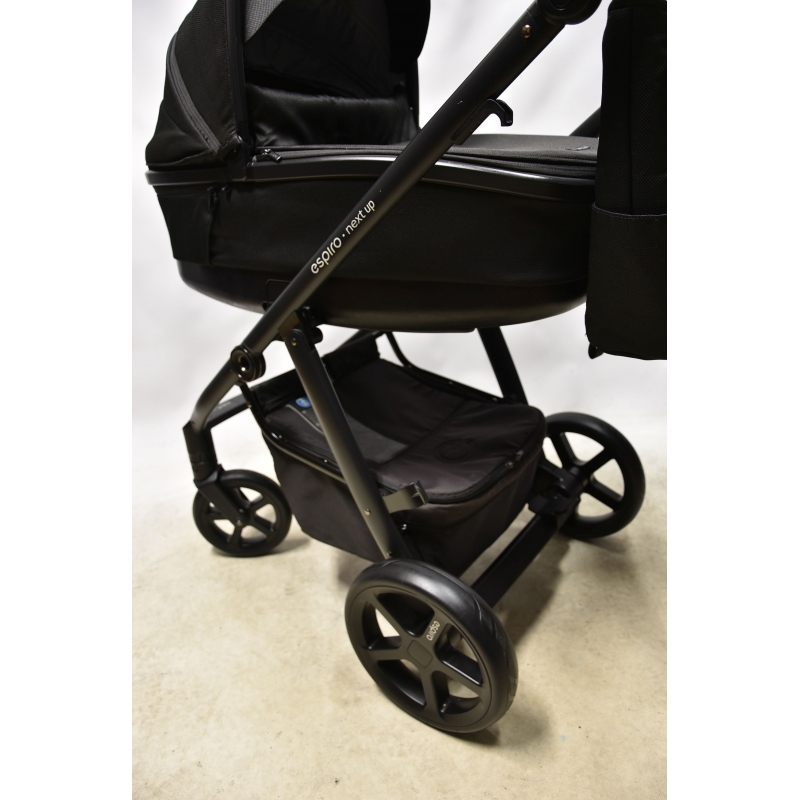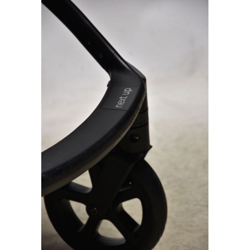 Stelaż wózka next ma służyć rodzicom i dzieciom nawet przez 4 lata. aby był jak najlżejszy został wykonany z trwałego aluminium. Wózek wyposażony jest w 4 bezobsługowe koła, których nie da się przebić, ani nie trzeba pompować. Wnętrze kół wypełnia superlekka tzw. pianka EVA, która zapewnia doskonałą amortyzację, a na zewnątrz kół znajduje się gumowa opona z bieżnikiem. Wózek posiada nowoczesny zabudowany mechanizm amortyzacji wszystkich kół - osłony chronią go przed zabrudzeniami i uszkodzeniami. Wpinany na stelaż pojemny kosz mieści wiele akcesoriów, a zapinana na zamek pokrywa zebezpiecza je przed wypadaniem.