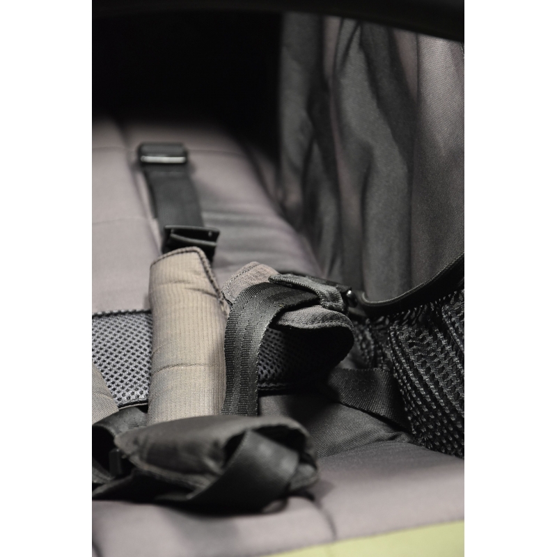 Aby zapewnić dziecku komfortową pozycję podczas podróży, oparcie wyposażone zostało w mechanizm regulacji pochylenia. Oprócz tego siedzisko posiada system wentylacji a miękko wyściełane pasy pięciopunktowe zapewnią maluchowi bezpieczeństwo. Amortyzowany stelaż osadzony na dużych, pompowanych kołach to pewność, że dziecko będzie miało wygodną podróż nawet w przypadku jazdy po trudniejszym terenie.