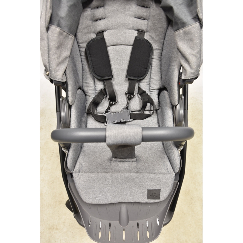 Bloom posiada regulowane oparcie do pozycji leżącej w wersji spacerowej, regulowany podnóżek odpinaną barierkę, obszytą eko-skórą.