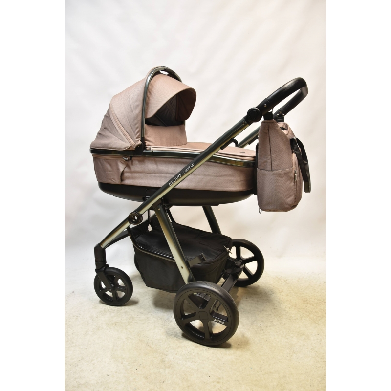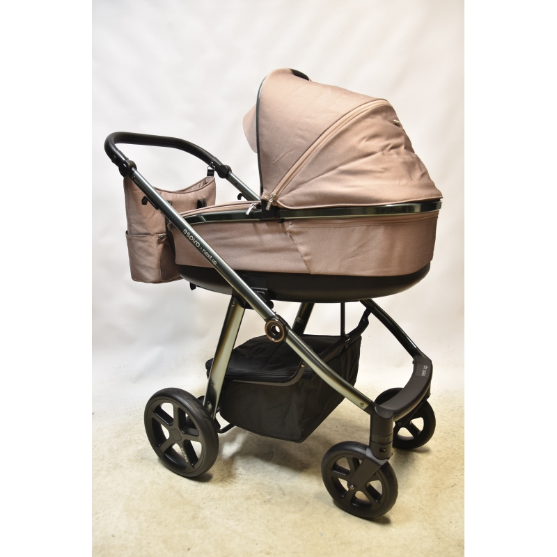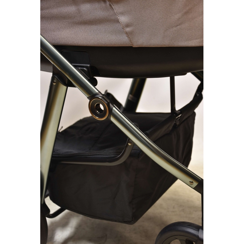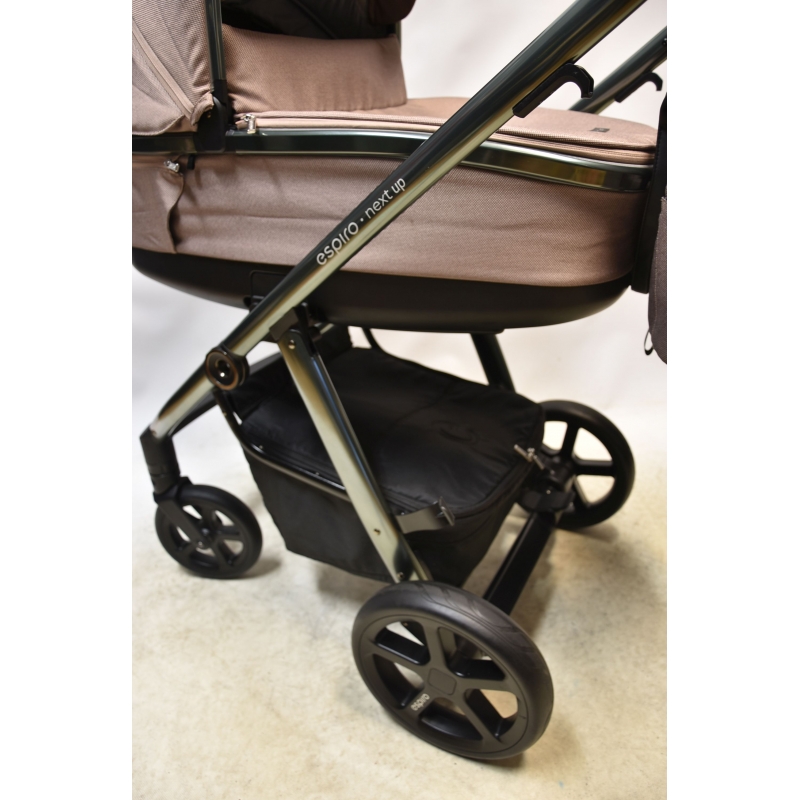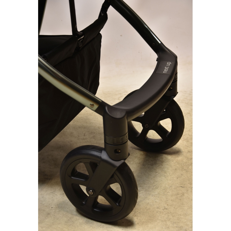 Stelaż wózka next ma służyć rodzicom i dzieciom nawet przez 4 lata. aby był jak najlżejszy został wykonany z trwałego aluminium. Wózek wyposażony jest w 4 bezobsługowe koła, których nie da się przebić, ani nie trzeba pompować. Wnętrze kół wypełnia superlekka tzw. pianka EVA, która zapewnia doskonałą amortyzację, a na zewnątrz kół znajduje się gumowa opona z bieżnikiem. Wózek posiada nowoczesny zabudowany mechanizm amortyzacji wszystkich kół - osłony chronią go przed zabrudzeniami i uszkodzeniami. Wpinany na stelaż pojemny kosz mieści wiele akcesoriów, a zapinana na zamek pokrywa zebezpiecza je przed wypadaniem.