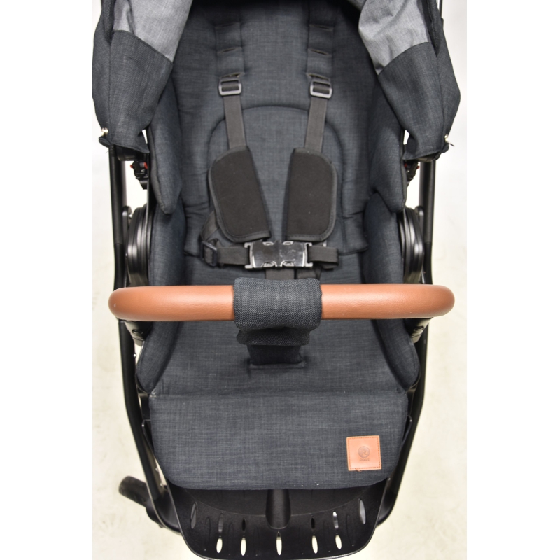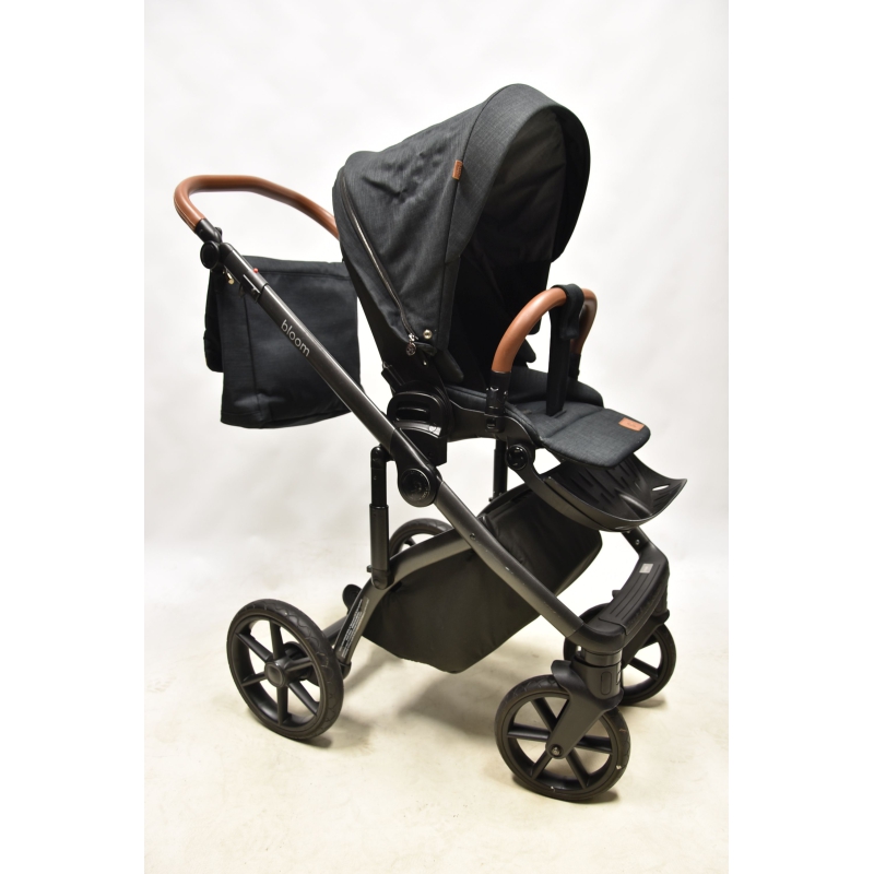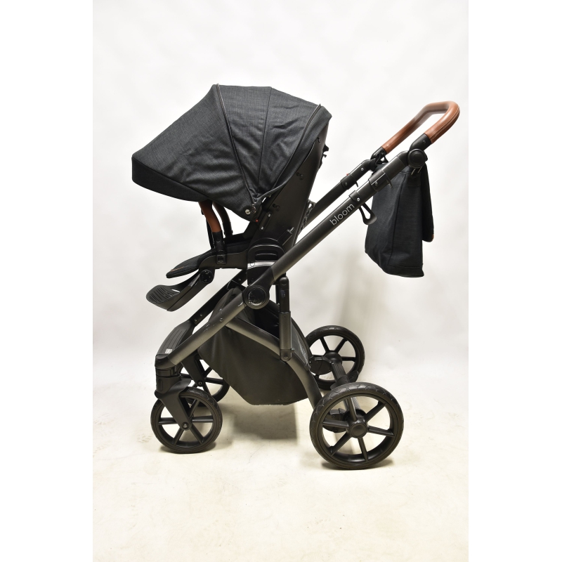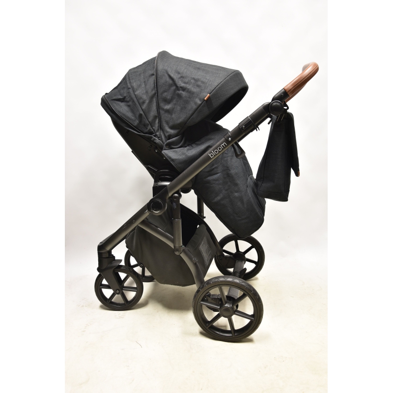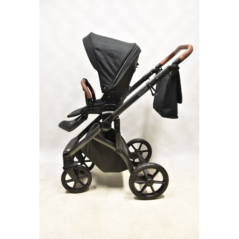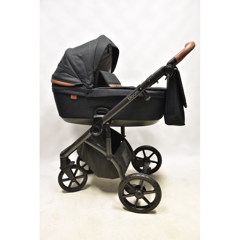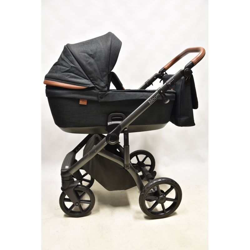 Bloom posiada regulowane oparcie do pozycji leżącej w wersji spacerowej, regulowany podnóżek odpinaną barierkę, obszytą eko-skórą.